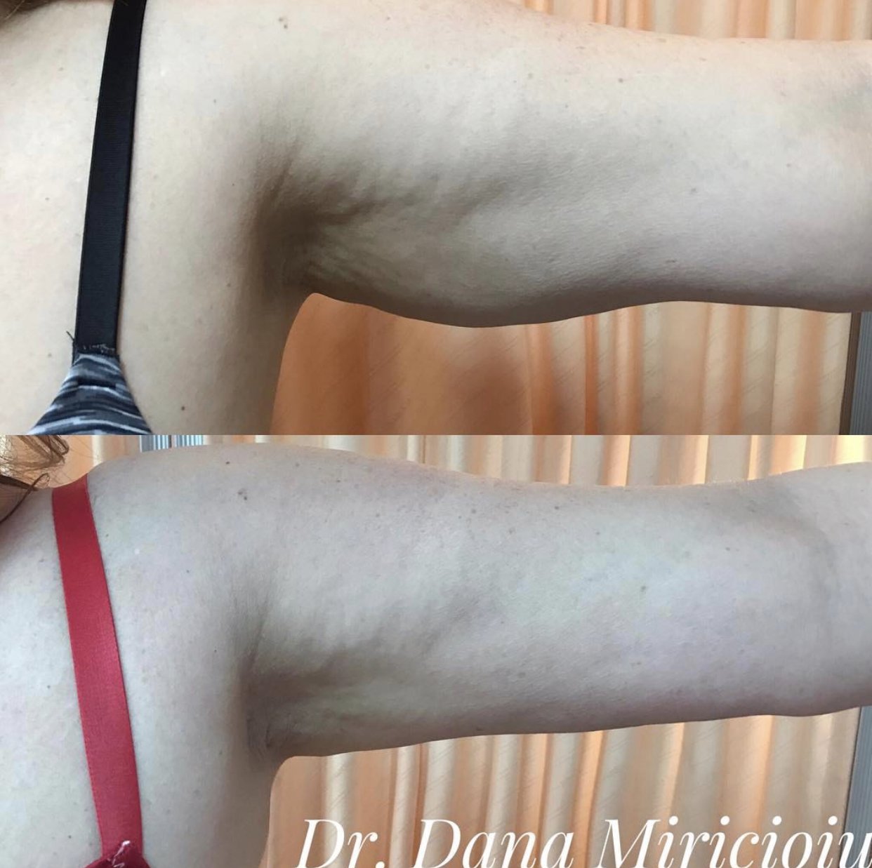 Cicatricea rezultată în urma exciziei de piele trebuie atent îngrijită, inițial printr-o igienă riguroasă. După primele două săptămâni, se vor aplica unguente speciale sau plasturi siliconici care vor dirija cicatrizarea și vor preveni cât se poate o vindecare defectuoasă. Care sunt efectele secundare ale liftingului de brațe? Cicatricea este inițial roșie și va rămâne în acest stadiu inflamator timp de câteva săptămâni sau chiar luni. Maturarea cicatricei va dura însă un an de zile. Imediat după operație, unii pacienți pot avea senzații de apăsare în partea superioară a brațului, datorată edemului apărut în urma intervenției. Alteori, pacienții pot simți furnicături la nivelul mâinilor. Toate aceste simptome dispar în câteva săptămâni după operație.