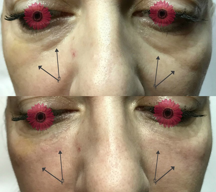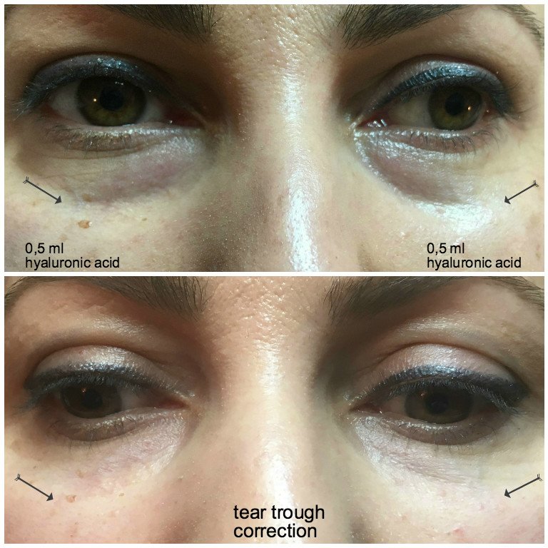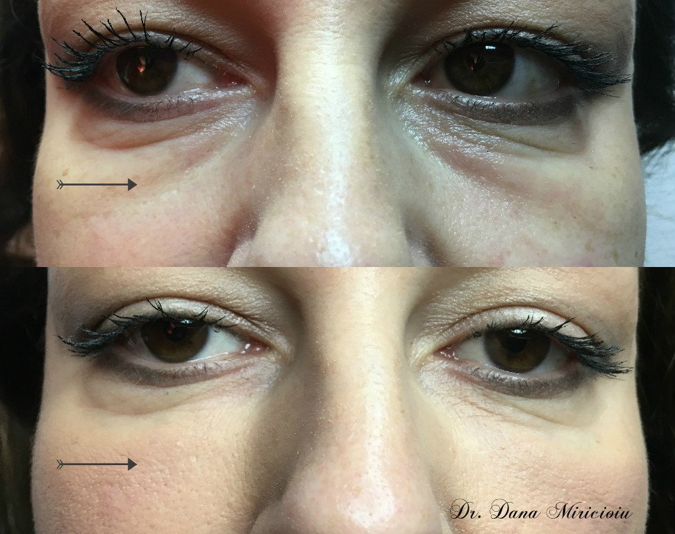 Dacă tratamentul pungilor de sub ochi (săculeții de grăsime vizibili și proeminenți de la pleoapa inferioară) se realizează prin îndepărtarea chirurgicală a acestora (blefaroplastie inferioară), ridurile adânci de sub ochi le corectăm prin injectare cu acid hialuronic. Acesta are un efect foarte frumos de umplere a acestui spațiu care se afundă odată cu înaintarea în vârstă, din cauza scăderii elasticității pielii și a pierderii de volum de țesut în această zonă. Efectul lui este excepțional în acest caz! Însă nu are niciun efect asupra aspectului întunecat al pielii din jurul ochilor. Așa cum nici blefaroplastia nu poate îmbunătăți această problemă, ci doar pe cea a punguțelor de sub ochi. În acest caz, se pune problema unui tratament de depigmentare a cearcănelor.